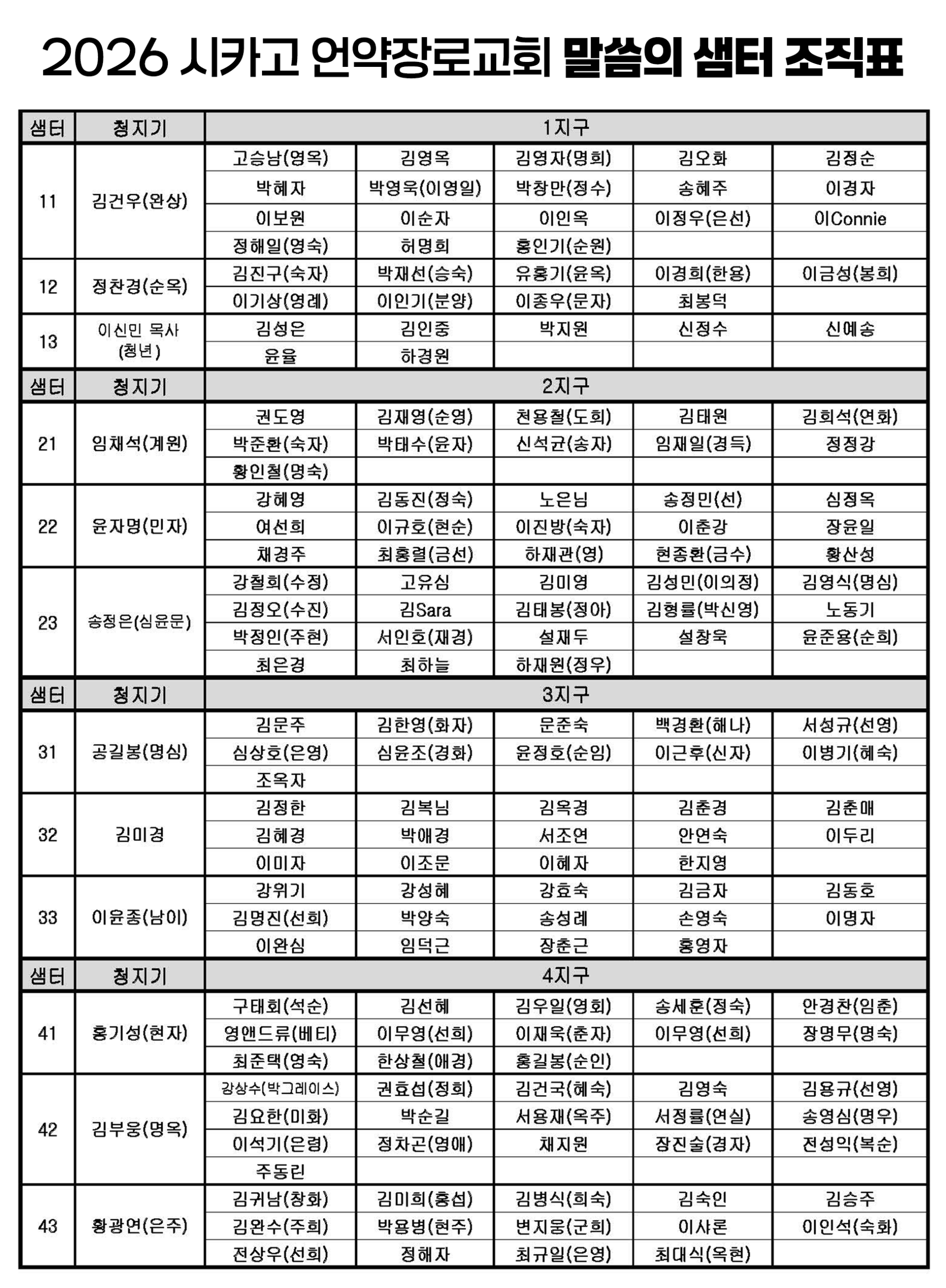 시카고 언약장로교회의 ‘샘터’는 성도들이 하나님의 말씀을 함께 나누고 삶을 공유하며 영적으로 성장하는 소그룹 모임입니다. 이 모임을 통해 성도들은 서로를 격려하고 지지하며, 공동체의 믿음을 더욱 굳건히 세워갑니다. 샘터는 매월 각 그룹별로 정해진 시간에 모임을 가지며, 이를 통해 성도들은 친밀한 교제를 나누고 신앙의 깊이를 더해갑니다